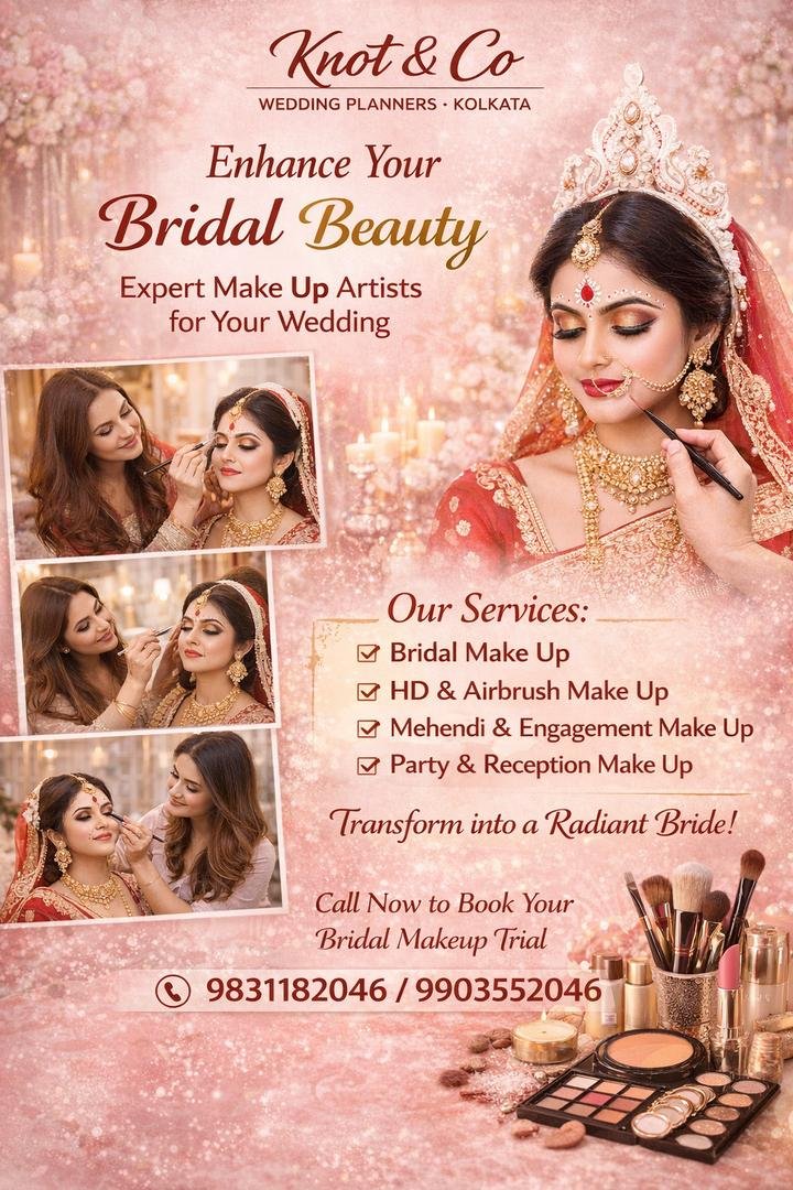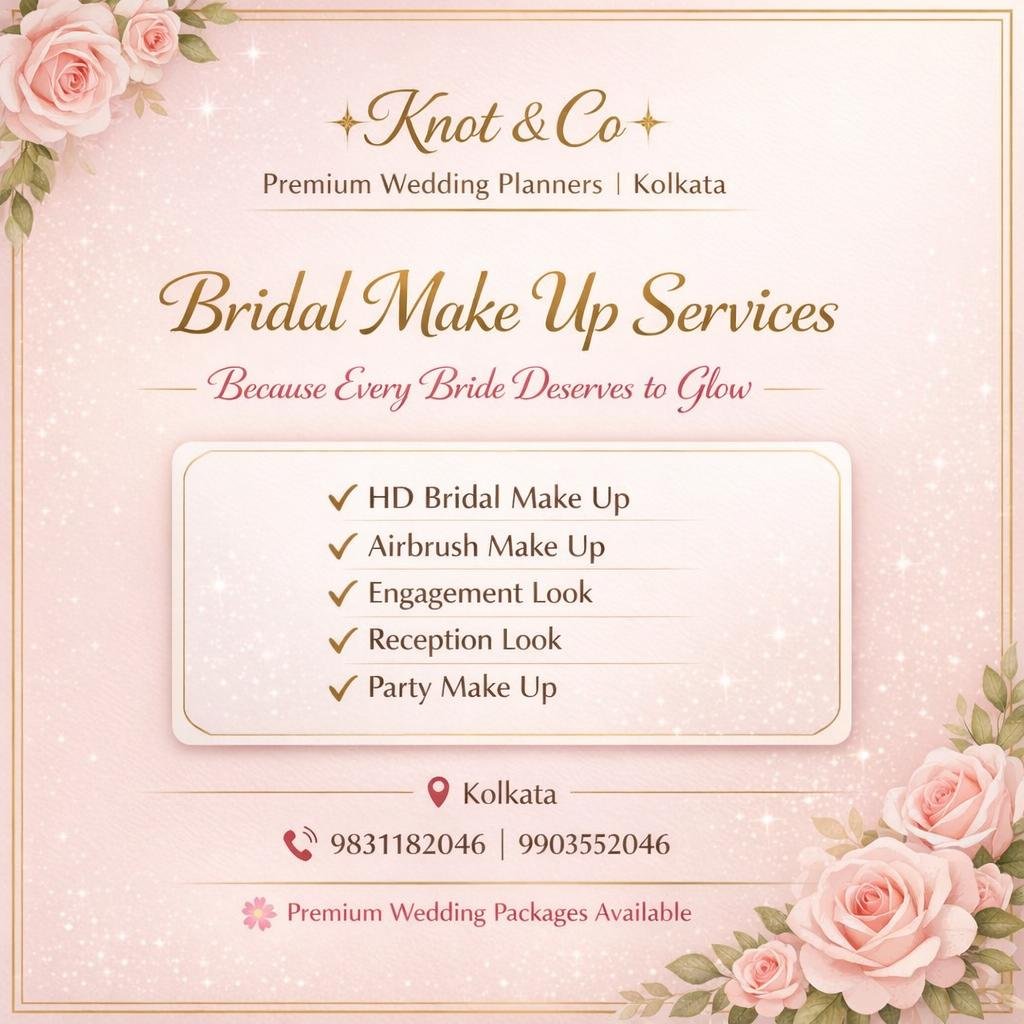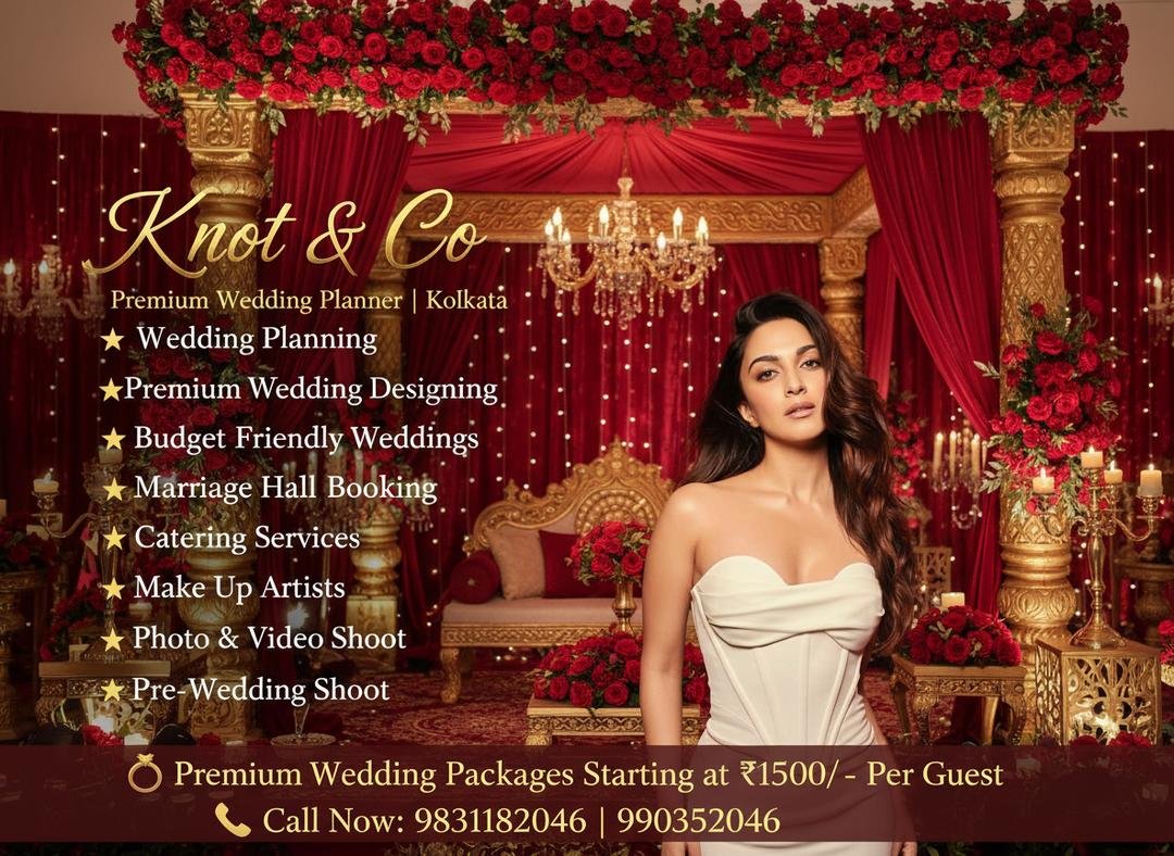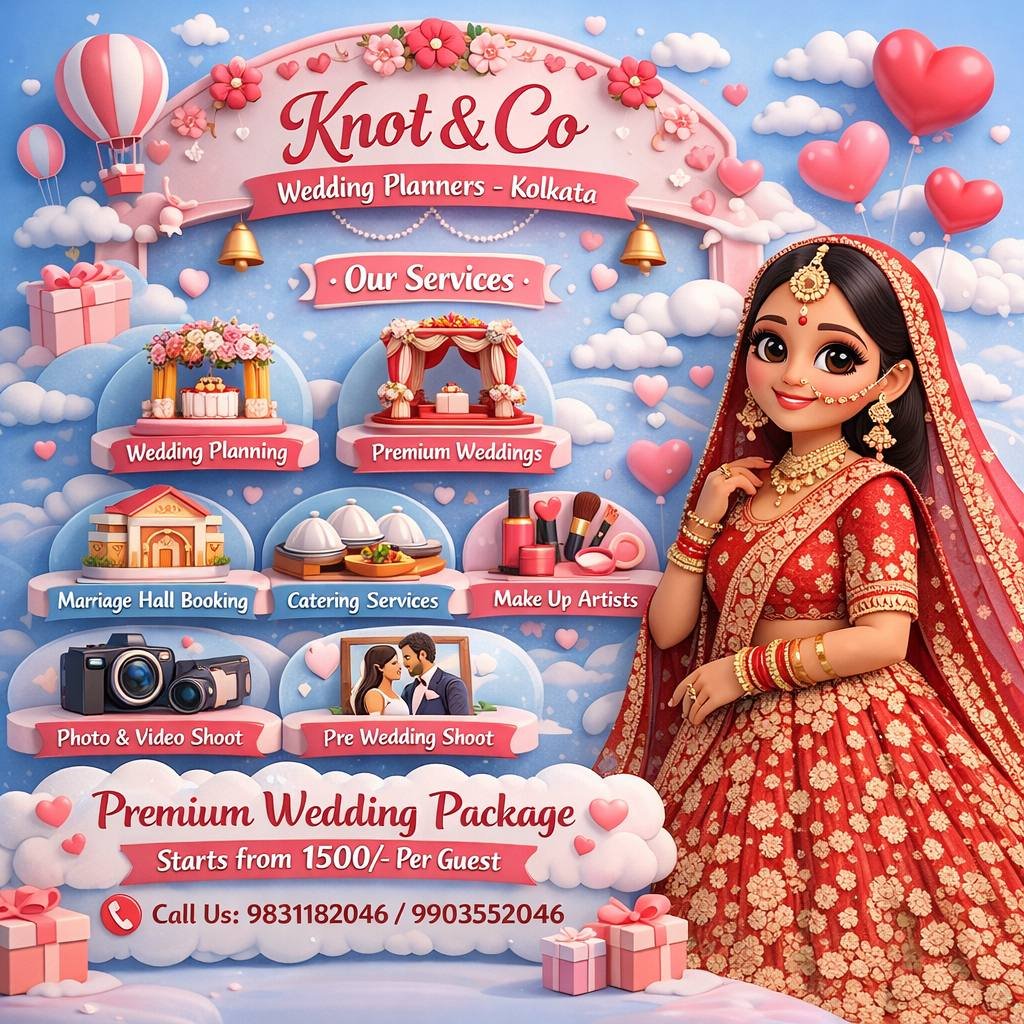Knot & Co is a leading wedding planner in Kolkata, specializing in premium weddings, budget-friendly weddings, and complete wedding planning services. We turn your dream wedding into a beautifully organized and stress-free celebration. From elegant décor and venue selection to catering, makeup artists, and professional photo & video shoots, we manage every detail with perfection. Our services include marriage hall booking in Kolkata, luxury wedding designing, customized theme décor, catering services, bridal makeup artists, photography & videography, and pre-wedding shoots. Whether you are planning a grand premium wedding or an intimate budget wedding, Knot & Co ensures flawless execution and unforgettable memories.